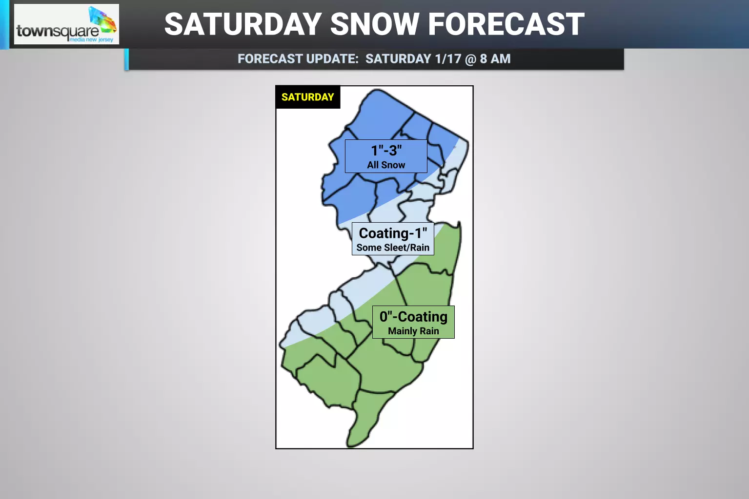 Accumulations... Where the heaviest precipitation bands meet the coldest temperatures in northwestern New Jersey, about 3 inches of snow accumulation is expected. That is enough to cause problems on roads (especially untreated ones), and enough to have to shovel and plow. Farther south, where snow is lighter and/or rain mixes in, a slushy inch or so is expected on the ground along the Turnpike corridor. For southern and coastal New Jersey, little to no accumulation is expected from Saturday's storm.