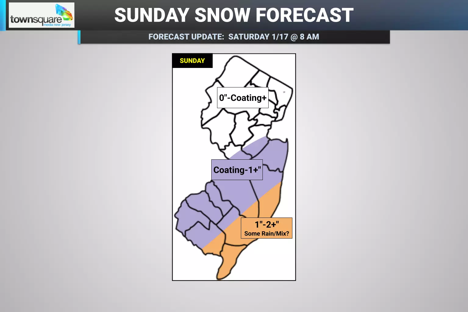 The Bottom Line... New Jersey's next storm system arrives on Sunday, a piece of coastal energy that is still expected to stay mainly off-shore. However, some model guidance has taken a notable jog to the west — closer to New Jersey — raising eyebrows to the possibility of more widespread and heavier snowfall. It's not quite time to ring those alarm bells yet — it is foolish to drastically change a forecast based on one model run, and we still have a pretty significant storm system signal in the way (Saturday's) before we can deal with the next one (Sunday's). So we're still wading through uncertain waters here. I'm putting forth what I think is a "most likely" forecast scenario. But please keep in mind there is a higher snow scenario (denoted by the "plus" symbols on my forecast map). And also a "nothing at all" solution on the table too, if this thing takes a wide right turn out too.